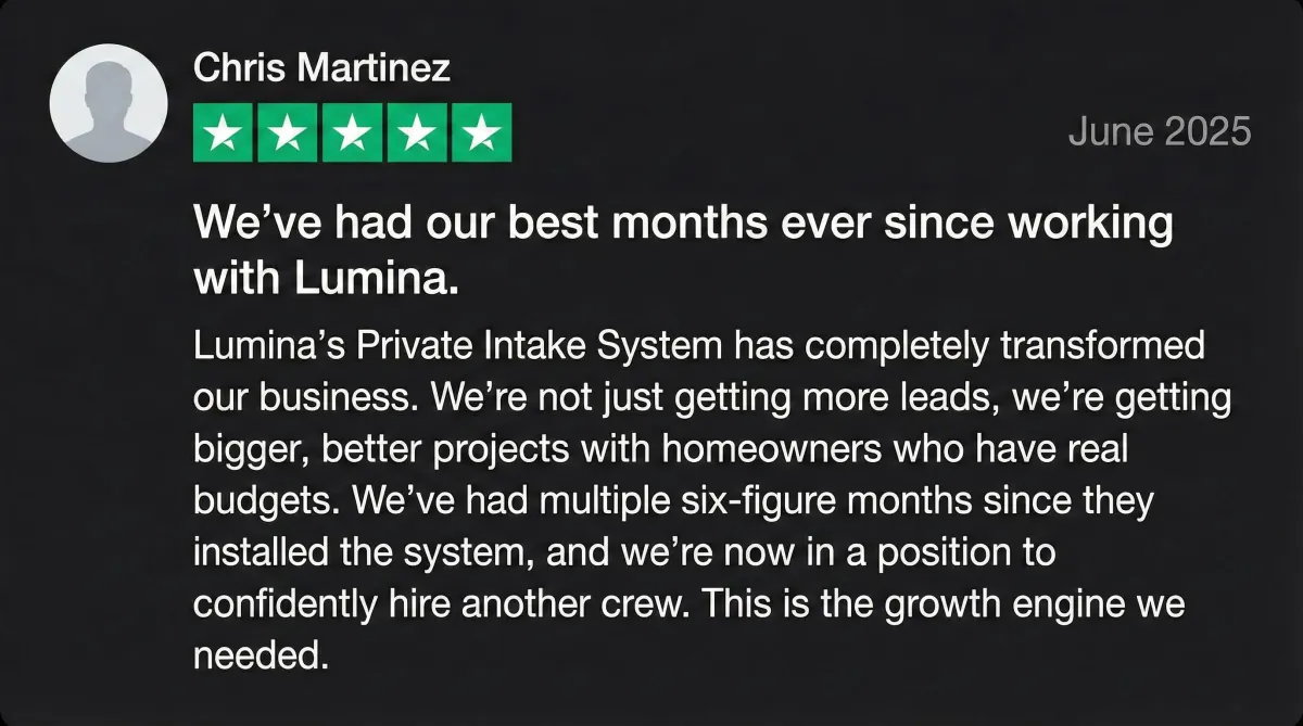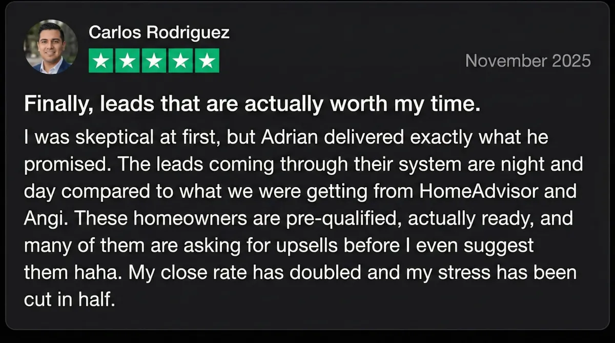 P.S. - We only work with ONE remodeler per geographic area to maintain exclusivity. If we already have a partner in your market, we literally cannot work with you—even if you want to pay us. Book your Market Availability Report now to see if your area is still open.